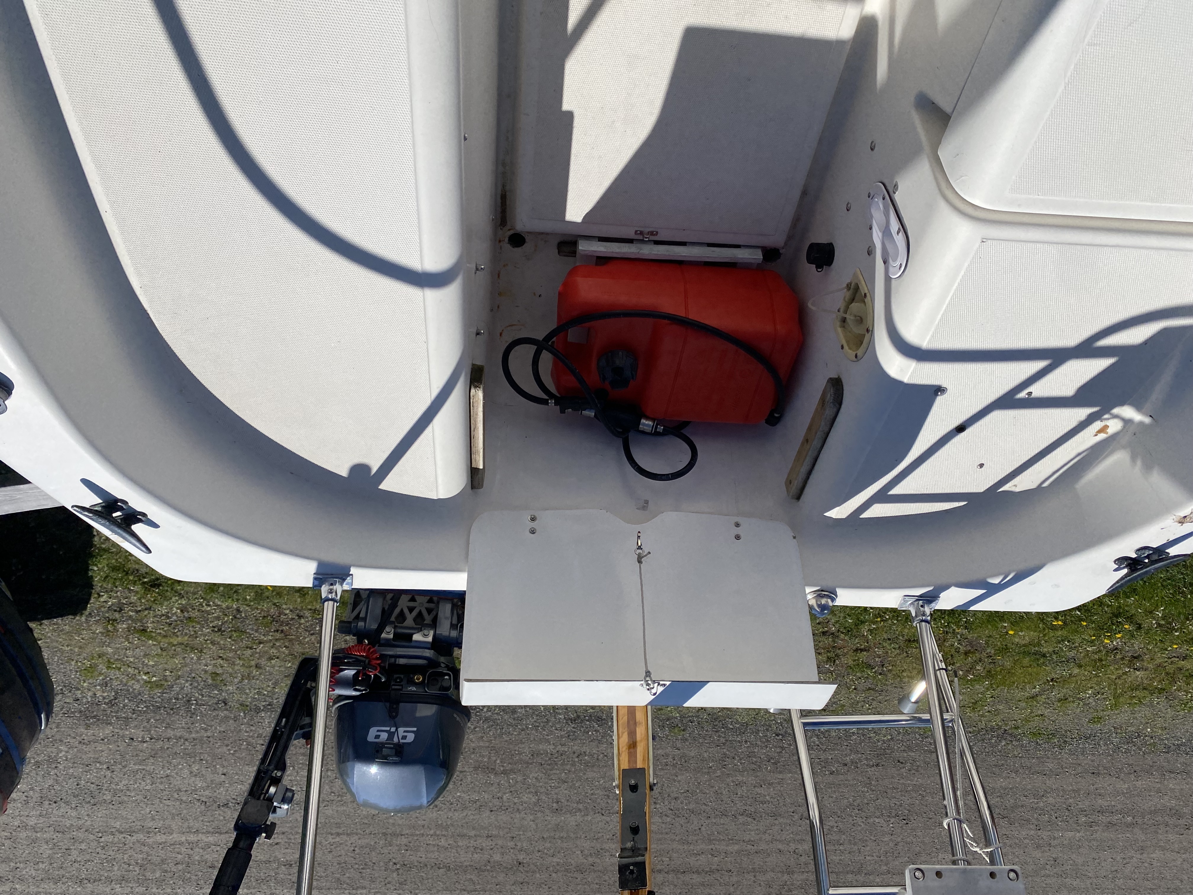triangular dock box (like new), tiller extension, spare lines galore, several new large winter tarps, cockpit rain tarp, lots of spare parts